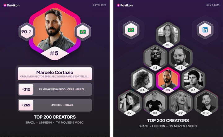 5º lugar no ranking Favikon na categoria TV, Filmes & Vídeo no LinkedIn Brasil e mais de 1 milhão de impressões em conteúdos sobre storytelling, criatividade e liderança.