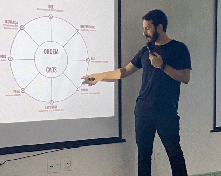 Palco no HackTown, direção de séries e branded content, podcasts, roteiros e projetos que conectam cultura e estratégia. Toda essa multiplicidade virou método: o Condutor Narrativo.