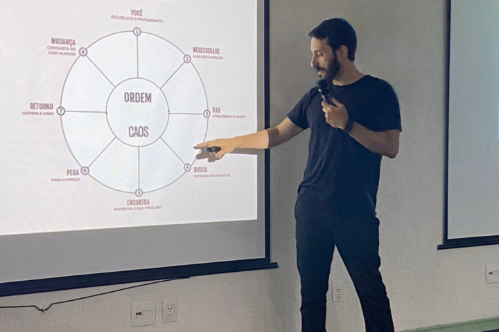 Palco no HackTown, direção de séries e branded content, podcasts, roteiros e projetos que conectam cultura e estratégia. Toda essa multiplicidade virou método: o Condutor Narrativo.